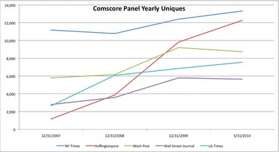 Lancé il y a seulement cinq ans, le HuffingtonPost a fait le pari de s’appuyer sur le meilleur de la blogosphère américaine plutôt que sur une rédaction de journalistes professionnels : il talonne désormais sur Internet le New York Times avec 12,3 millions de visiteurs uniques aux États-Unis contre 13,1 millions pour la “vieille dame grise” (bientôt 160 ans au compteur) ! C’est l’institut Comscore qui a récemment publié ces chiffres pour le mois de mars. Le site fondé par la journaliste politique américaine Ariana Huffington et son confrère Ken Lerer avait déjà coiffé au poteau ce bon vieux Washington Post en fin d’année dernière, et devance largement le grand Wall Street Journal comme le montre le graphique ci-dessous :