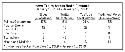 Vous doutez encore du professionnalisme des blogueurs ? Olivier, un ami lecteur fidèle de mon blog, qui vient lui même d’ouvrir le sien ["Le blog du communicant 2.0"], m’a envoyé cette étude du Project for Excellence in Journalism (PEJ) intitulée “New media, old media” comparant la manière dont les blogs et les médias sociaux couvrent l’actualité par rapport à la presse traditionnelle, pour ne pas dire la vieille presse. Et bien selon les chercheurs de ce département du fameux Pew Research Center, ils la couvriraient plutôt bien… voire parfois mieux que certains journaux que l’on trouve encore en kiosques à plusieurs centaines de milliers d’exemplaires de l’autre côté de l’Atlantique.