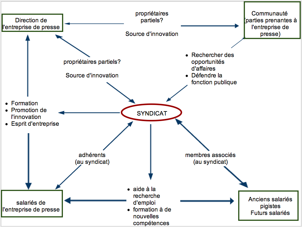 Le plus déroutant —pour un Français— dans ce schéma tient au fait que le syndicat « veut jouer un rôle plus important comme business partner », en particulier en facilitant les membres de la communauté qui souhaiteraient participer à l’entreprise de presse. Plus classiquement avec l’accent mis la formation, pour laquelle le syndicat veut être une ressource, on retrouve une forme de syndicalisme proche de celle en vigueur dans les pays nordiques.