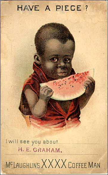 Par exemple la pastèque revient beaucoup, elle était un aliment typiquement réservée aux noirs : pauvre en nutriments, pas cher et … proche de l’image des lèvres et du crâne … (Inutile de vous rappeler la stupidité du truc)