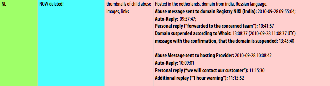 Récemment, eco, association allemande des industriels d’Internet a révélé que “des 197 sites qui ont été signalés au cours du premier semestre 2010 au bureau des plaintes d’eco, 194 ont pu être supprimés dans le délai d’une semaine“. Et que les contenus hébergés sur des serveurs allemands “étaient hors ligne en une journée“.