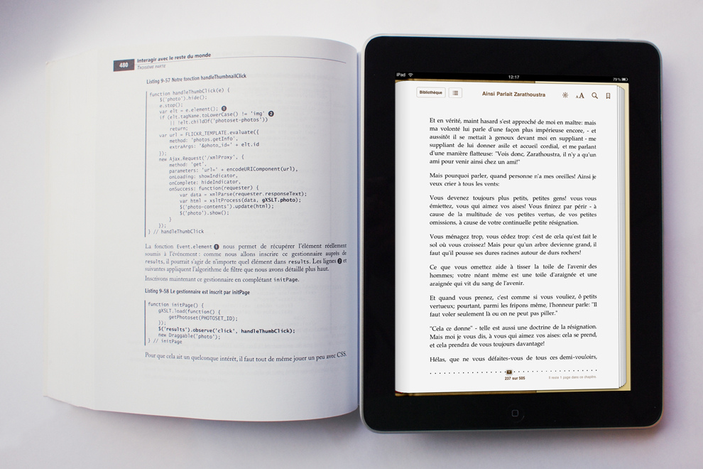 Ma vision est peut-être extrêmement naïve, mais je vois mal comment faire décoller les usages alors que l’offre est aussi pauvre. Certes, le marché va pouvoir compter sur les initiatives d’acteurs industriels (Amazon vient juste d’ouvrir la version anglaise de son Kindle Store et Google lancera d’ici la fin de l’année son offre Google Editions au Japon) mais il manque à mon sens un stimuli fort pour viabiliser le créneau. Les interfaces riches au secours de l’e-édition ? Pourquoi pas…