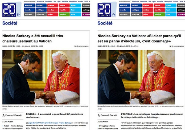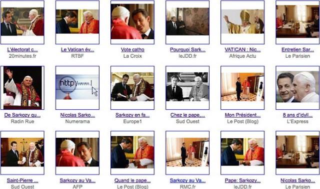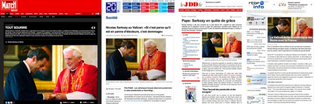 La visite éclair de Nicolas Sarkozy au Vatican n’a pas été traitée comme un événement majeur. La plupart des rédactions se sont contentées de reprises plus ou moins développées des dépêches d’agence. Malgré le cliquetis permanent des obturateurs qui frappe à l’écoute de la vidéo de la rencontre diffusée sur le site de l’Elysée, le traitement iconographique n’a pas fait l’objet de beaucoup plus d’efforts. L’image qui a été la plus reproduite était celle qui sortait du lot, dans un ensemble de vues plutôt figées ou stéréotypées – mais c’était aussi l’une des premières images diffusées, par l’AFP aussi bien que par Reuters, puisque réalisée en “pool”.