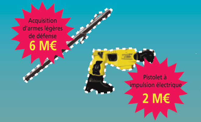 Si la LOPPSI 2 ne prévoit pas d’augmenter les effectifs de la police et de la gendarmerie, elle consacre néanmoins 155 millions d’euros à l’amélioration de ses équipements, véhicules et armements : lunettes de protection, gilets tactiques et pare-balles (24M€), cinémomètres LASER de nouvelle génération “permettant d’effectuer des mesures de vitesse sous de mauvaises conditions météorologiques” (5M€), jumelles de vision nocturnes “pour optimiser les moyens aériens” (1M€), acquisition d’”armes légères de défense” (6M€), de lanceurs de 40 mm et de pistolets à impulsion électrique (2M€), mais également de “lanceurs d’eau” (3M€)…