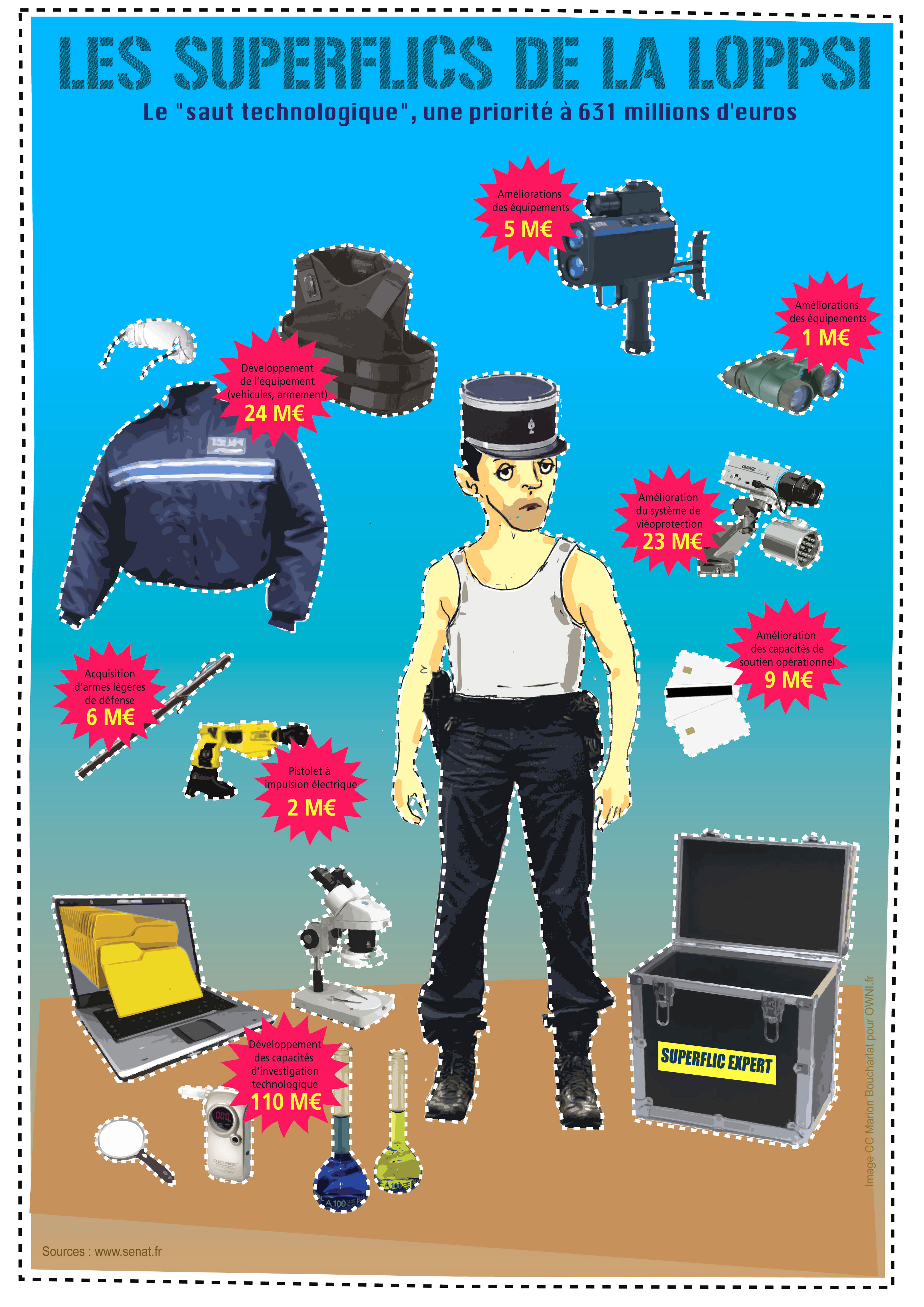 À effort budgétaire constant“, l’accent est ainsi mis sur la “modernisation technologique” des forces de police et de gendarmerie. Eric Ciotti, rapporteur de la LOPPSI2 à l’Assemblée nationale, se félicitait ainsi du fait que “70 % des crédits supplémentaires dégagés grâce à la LOPPSI seront utilisés pour financer des dépenses de fonctionnement ou d’équipement“, soit 1,773 des 2,539 milliards d’eurosdestinés à financer spécifiquement les priorités de la LOPPSI 2” :