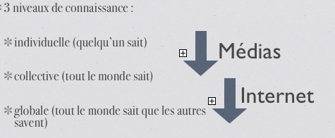 Les spécialistes de l’informatique théorique ont l’habitude de structurer la connaissance en trois niveaux : la connaissance individuelle (quelqu’un sait), la connaissance collective (tout le monde sait), et la connaissance globale (tout le monde sait que les autres savent). Le fameux quatrième pouvoir des médias consiste à savoir faire passer du niveau un au niveau deux ; tout le monde (ou presque) ayant lu les journaux, écouté la radio, vu la télévision. La grande puissance d’Internet est de faire passer du niveau deux au niveau trois.