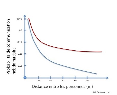 Il a ainsi démontré que la probabilité de communication entre deux individus baisse extrêmement rapidement en fonction de la distance les séparant. Ainsi, au delà de 10 mètres, il y à moins de 10% de chance que deux personnes communiquent une fois par semaine. De la même manière, il existe deux fois plus de communications entre deux personnes séparées de 10 mètres, que deux autres personnes séparées de 20 mètres. Je suis certain qu’en se penchant sur ce sujet, vous constatez la même chose autours de vous, dans votre open space.