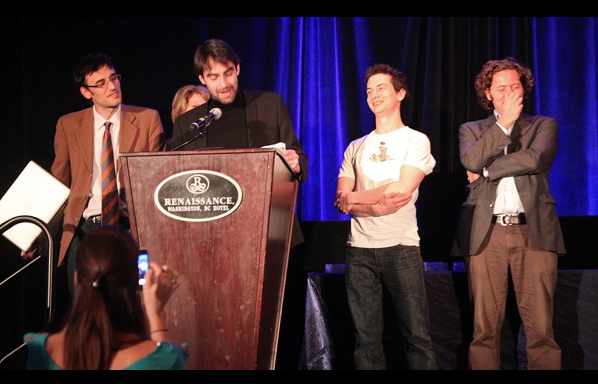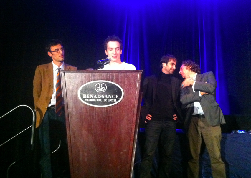 Le 30 octobre 2010, à 22h, soit 4 heures du matin heure française, et après un moment de pression digne d’un James-Bond-ou-presque, les 4 petits français que nous sommes (ici de gauche à droite : Adriano Farano, Nicolas Kayser-Bril, Nicolas Voisin et Franz Vasseur) ont eu l’ultime confirmation de cette victoire… Et ont gravi la scène de ce qu’il est convenu d’appeler les Oscars du journalisme.