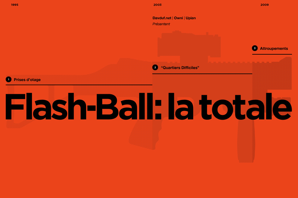 8 circulaires, 9 documents officiels dont le mode d'emploi des Flash-Ball, 15 ans de stratégie : une enquête de David Dufresne, un design d'Upian et un développent d'OWNI pour une application inédite. Flash-Ball : la totale.