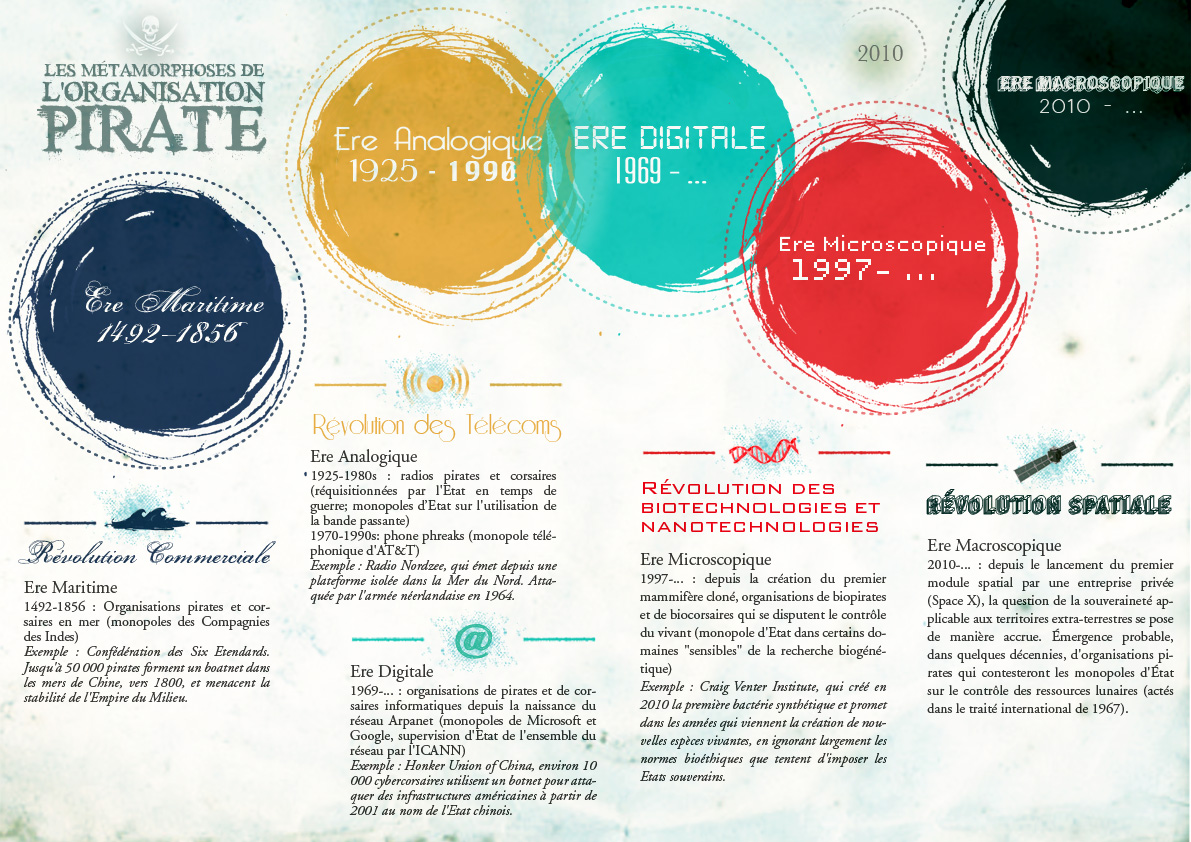 Ensuite, il y a la révolution numérique, avec la mise en place d’un nouveau réseau de communication, Internet. Encore une fois l’organisation pirate conteste certaines modalités d’imposition de normes par l’État. Il peut s’agir du filtrage du Net, des droits de propriété de certains contenus. Encore plus récemment est arrivée la révolution des biotechnologies, les États essayent de contrôler les normes qui peuvent être imposées sur la recherche en biogénétique, par exemple, ce qui peut être breveté ou pas. Il y a tout une série d’organisations pirates, qui vont des petits groupements d’amis qui font du DIY bio (do it yourself, ndlr) dans leur garage pour s’amuser, à des organisations beaucoup plus complexes et financées, comme Celera Genomics, qui vise à concurrencer les États dans la recherche en biogénétique et finalement, créer de nouvelles espèces vivantes brevetées, en dehors de toute légalité.