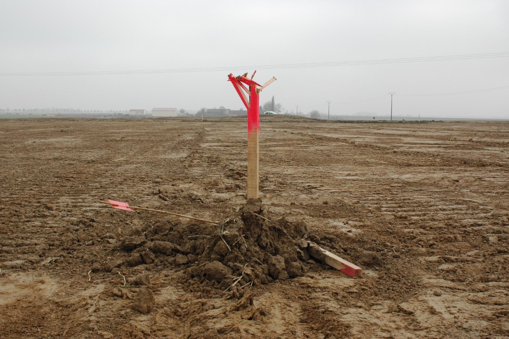 Quand l’équipe d’OWNI s’est rendue sur la plate-forme de Jouarre jeudi 16 février, les bulldozers avaient déserté, laissant en plan un champ boueux d’un hectare entouré de talus sur trois côtés au milieu duquel trônait un piquet de bois et une tige métallique bleue. Garé le long de la route, un employé de la Direction départementale de l’équipement et un groupe de salariés de Toréador nous ont aimablement salué avant de s’en aller. « Le maire de Jouarre était venu sur le chantier demander l’arrêt des opérations, » nous explique-t-on à la mairie. Mais la vraie décision est venue « d’en haut ». « Conformément à la demande de la ministre, les travaux ont été suspendus, nous répond-on en préfecture. Nous ne nous prononçons pas sur le sujet : nous ne faisons que relayer les communiqués du ministère sur la question. »