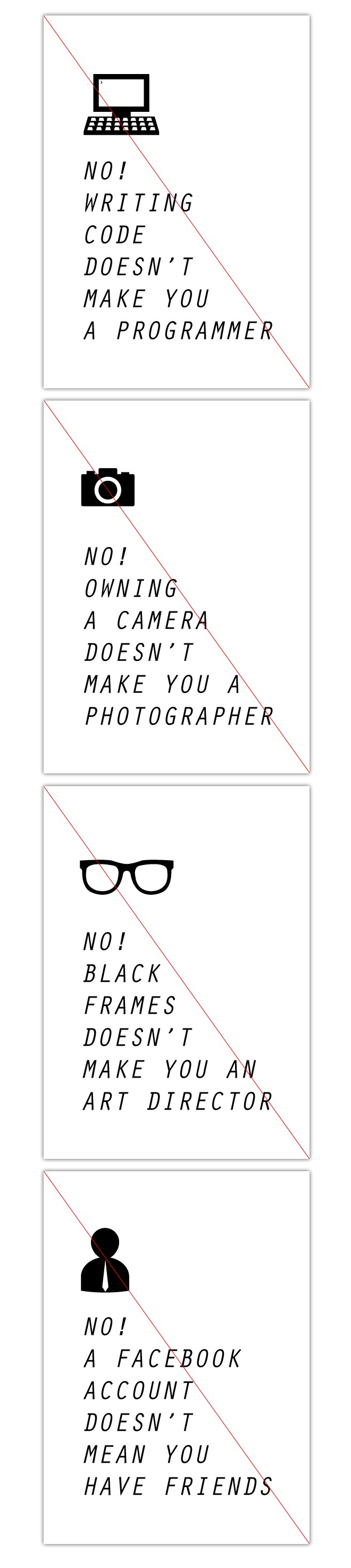 Franches et honnêtes, je voulais attirer votre attention sur ces affiches qui proposent de dire leurs «quatres vérités» aux “je veux être” (comme le chantait IAM à l’époque :-)). Gabriel Von Satzger, au travers de ses images nous affirme, que, non, écrire du code ne fait pas de vous un développeur, avoir un appareil photo ne fait pas de vous un photographe, avoir des lunettes à grosse monture ne fait pas de vous un directeur artistique (je confirme!), et termine sur une vérité absolue… avoir un compte facebook ne fait pas que vous avez des amis.