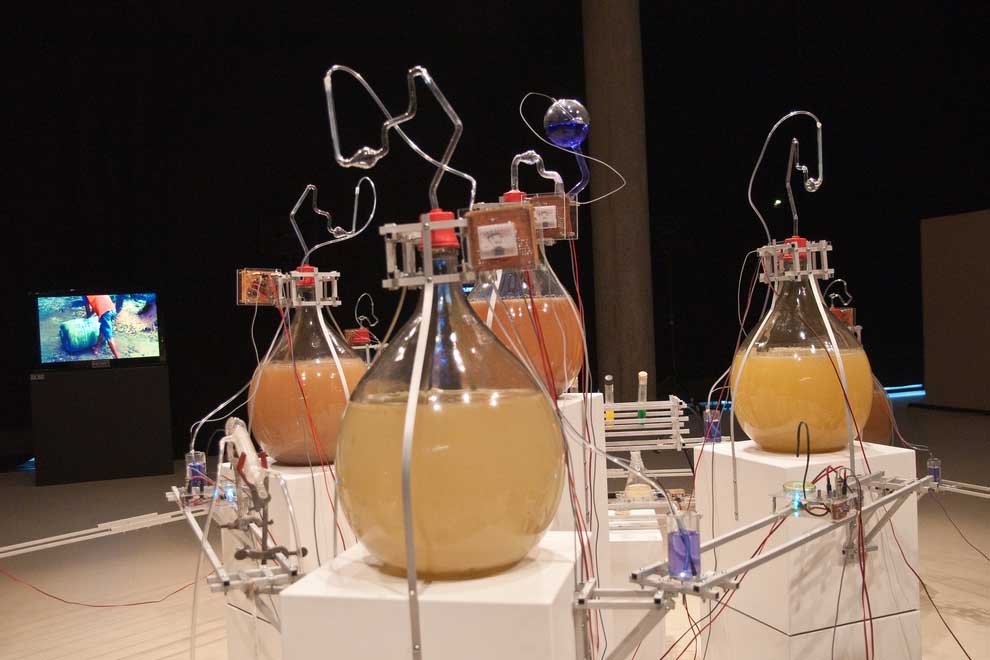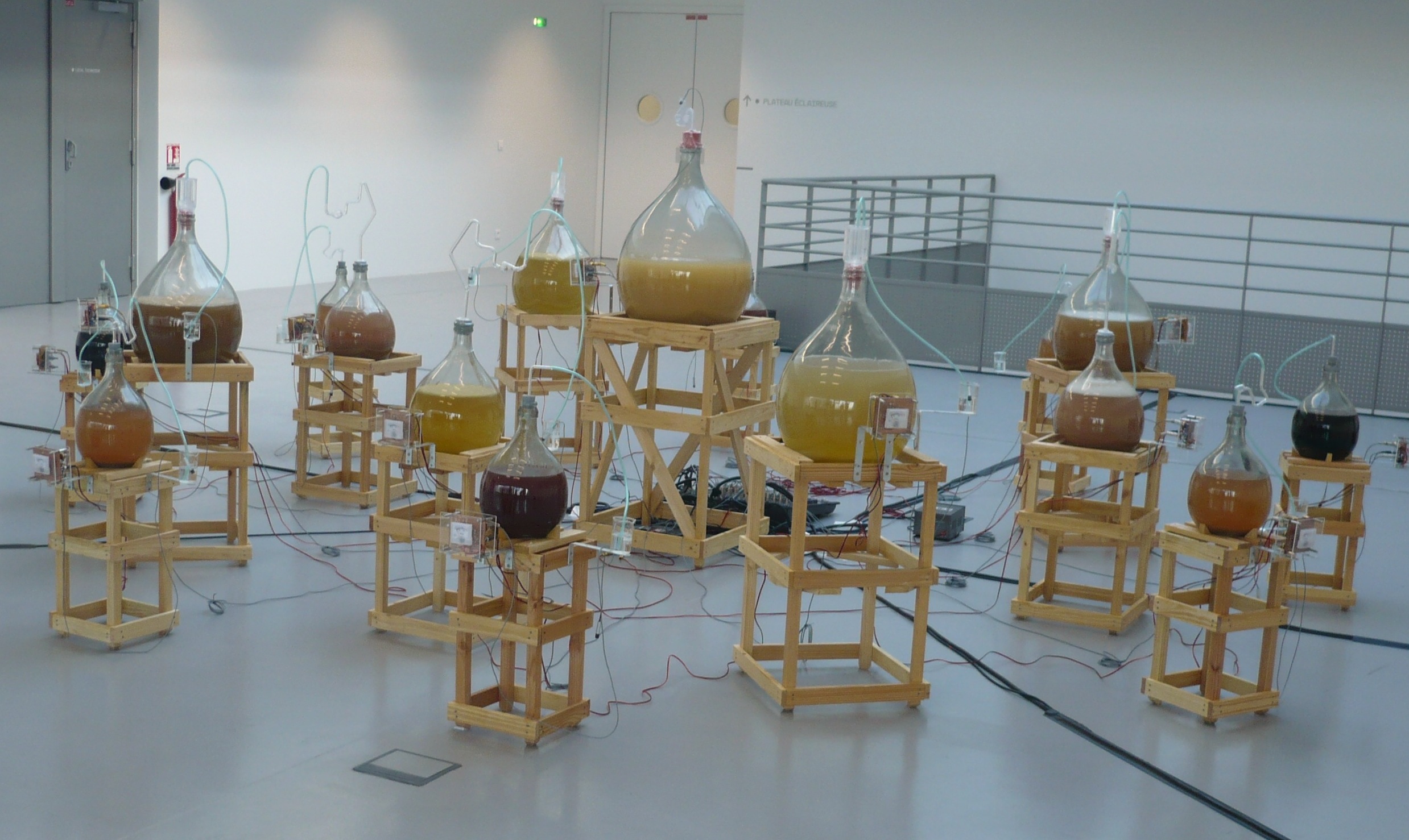 Avec ses grandes bonbonnes dans lesquelles fermentent des jus de fruit, l’installation acoustique, « Intelligent Bacteria – Saccharomyces cerevisiae » semble n’être qu’un prétexte, une opportunité de figer dans le temps et dans l’espace un projet dont les dimensions dépassent largement celle de la galerie qui la contienne.