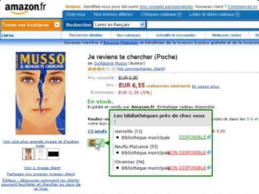 Damiano Albani, jeune informaticien indépendant et non-bibliothécaire avait il y a deux ans conçu un service à partir des données bibliographiques des bibliothèques françaises. Il s’agissait d’un script greasemonkey, qui, ajouté à Firefox permettait d’afficher en temps réel la disponibilité en bibliothèque d’un titre affiché sur Amazon ou Alapage ou d’autre libraires. Le site n’existe plus aujourd’hui. Concrètement ça donnait ça :