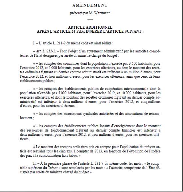 L’amendement Warsmann sera débattu dans la semaine et promet de relancer la très controversée réforme des juridictions financières. Le texte proposé (voir p.17 du Pdf) bouleverse l’organisation et le fonctionnement des Chambres régionales des comptes (CRC). Le texte autorise le gouvernement à définir par décret le nombre de CRC et, surtout, instaure la responsabilité de fait des gestionnaires publics.