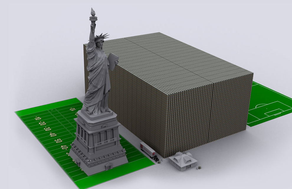 La visualisation la plus impressionnante est sans doute celle proposant de voir ce que représente la dette en billets physiques. On se rend compte que les 1,4 trillions de dollars deviendrait le plus haut gratte-ciels de New-York s’ils étaient constitués de billets de 100 dollars.