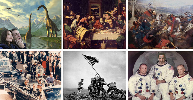 Le 9 novembre 2009, jour anniversaire de la chute du Mur de Berlin, les services de l’Élysée mettent en ligne sur le compte Facebook de Nicolas Sarkozy une photo le montrant en train d’attaquer la paroi de béton au marteau et datent par erreur cette image du 9 novembre 1989. Devant les protestations de plusieurs journaux, le camp gouvernemental s’enferre dans sa confusion et multiplie les allégations pour justifier cette manipulation. En 24 heures, la réponse du web fuse, sous la forme d’un mème intitulé “#sarkozypartout”. Plusieurs centaines d’images retouchées mettent en scène le président dans les situations les plus célèbres de l’histoire mondiale, de la préhistoire au premier pas sur la Lune en passant par la bataille de Poitiers, la prise de la Bastille, le sacre de Napoléon ou l’assassinat de Kennedy (voir ci-dessous). Comme la plupart des phénomènes viraux, cette création parodique collective, diffusée de manière dispersée sur plusieurs sites et réseaux sociaux, constitue un événement éphémère sans archive, tout entier contenu dans l’expérience d’une réactivité instantanée.