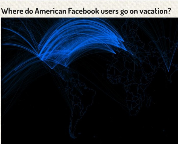 Pete Warden (ancien d’Apple, fondateur d’OpenHeatMap) nous explique sur O’Reilly Radar les dessous de sa dernière visualisation, qui permet d’observer où les usagers américains de Facebook partent en vacances et de constater ensuite, pour n’importe quelle destination, le top 10 des villes d’origine.