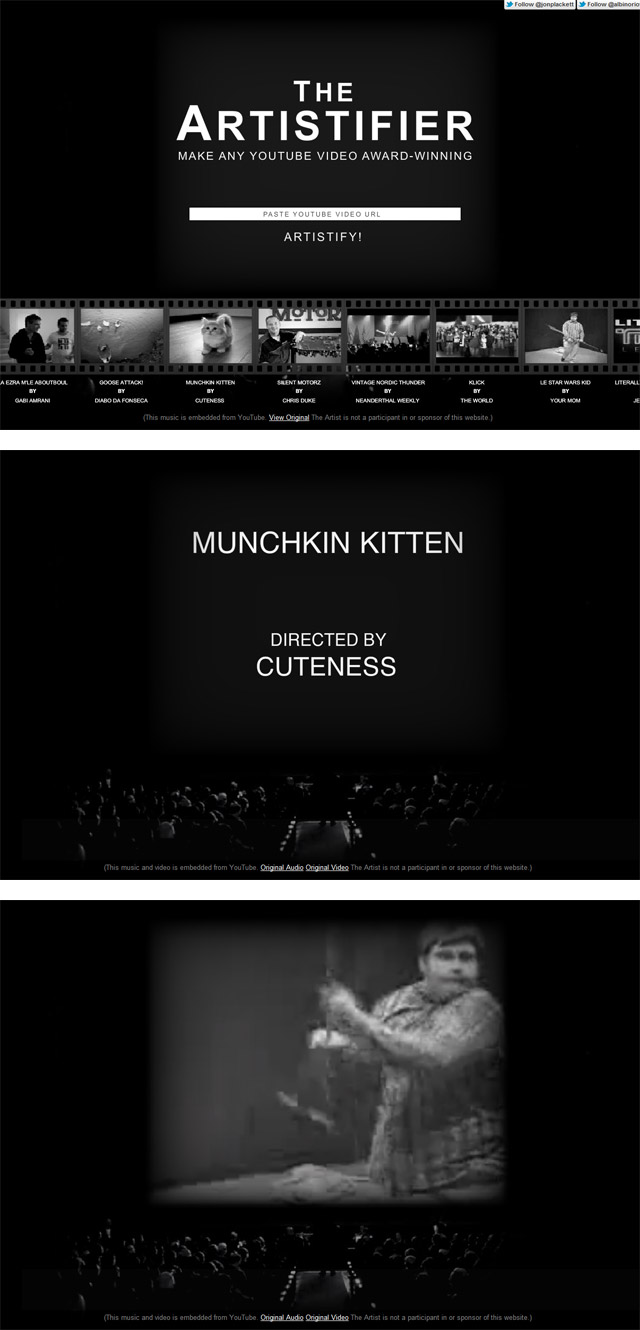 Le WTF de cette semaine est un site qui s’appelle “ARTISTIFIER” et qui va changer la face du monde comme “The Artist” l’a fait pour le cinéma ;-) Bon, je troll, mais derrière ce site se cache un générateur de films à la manière de “The Artist”, avec la musique, le noir et blanc, le public, et les titres. Pour concevoir votre propre film “The Artist”,  il vous faudra donc choisir une vidéo Youtube et un peu d’imagination, tout simplement :)