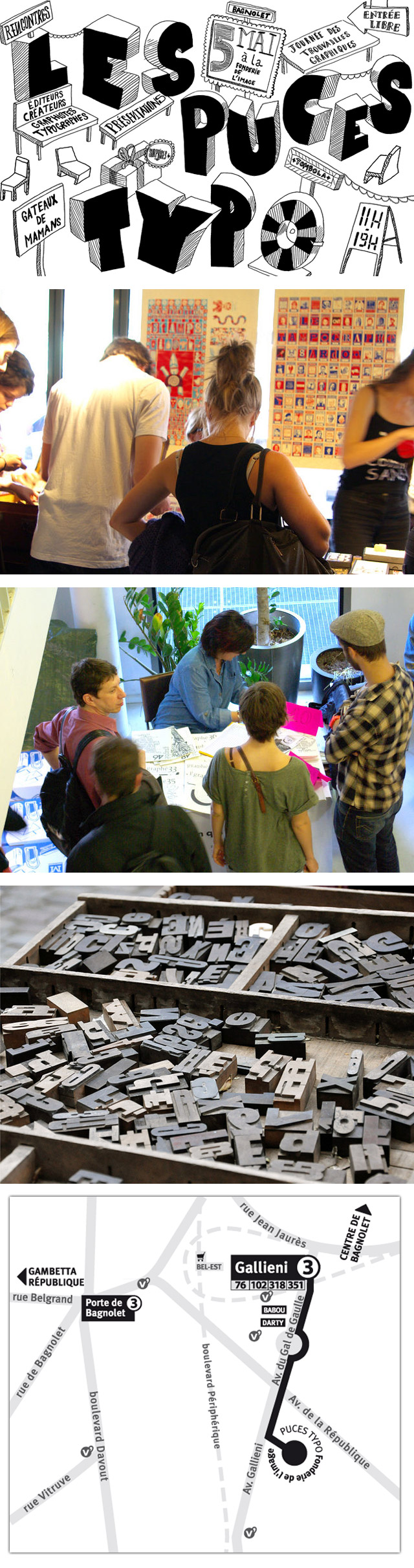 J’ai appris aussi une bonne nouvelle cette semaine, les Puces Typographiques sont de retour ! L’an dernier, souvenez-vous, je vous avais présenté l’évènement auquel j’avais participé. Et bien cette année, c’est toujours à  Bagnolet, et ce sera le 5 mai de 11h à 19h. Les Rencontres internationales de Lure et la Fonderie de l’Image se sont réassociées pour vous proposer un marché de la typo (et autres objets graphiques associés). Une journée printanière pour vider ses étagères et/ou remplir sa besace. Entrée libre pour les curieux de tous horizons.