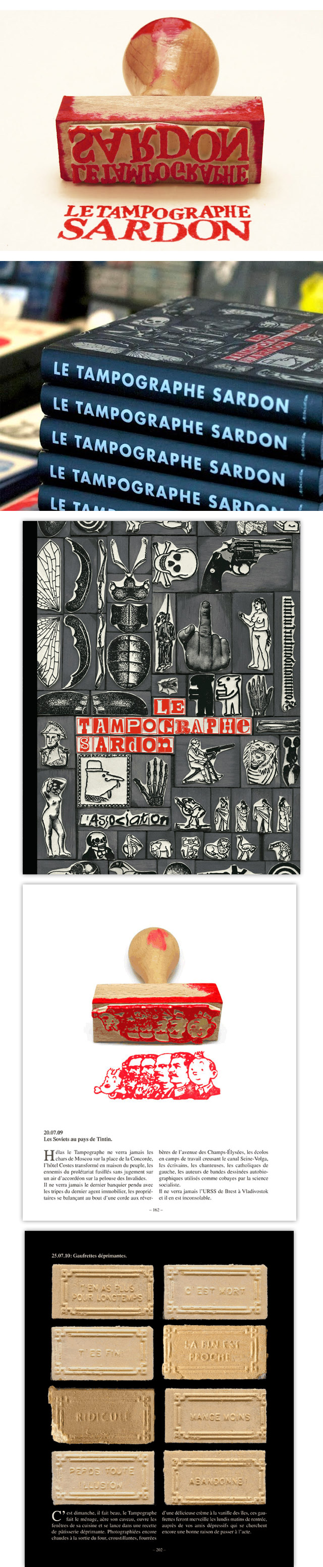 Cette semaine a également été l’occasion de voir la sortie du livre du Tampographe  Vincent Sardon ! Ce monsieur et amusant dessine et crée des tampons depuis des années. Ces tampons ont la particularité d’être grossiers, étranges, drôles, politiquement incorrectes, cinglants, satiriques, décalés, morbides… Bref, vous l’aurez compris, il ne fait rien comme les autres tampons ;-)