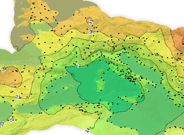 Les scientifiques et historiens travaillant sur Orbis ont même fait des cartes isochrones de Rome : c’est-à-dire des cartes dont les frontières sont modifiées pour représenter le temps de trajet pour arriver en son coeur, ici Rome. Le but de ce travail de recherche : comprendre comment une ville a pu soumettre une grande partie de l’Europe, notamment par l’étude de leurs modes de communication.