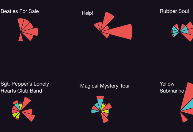 Note : Les Beatles, sans doute l’un des groupes le plus datavisé de tous les temps. En attendant la visualisation des visualisations, voici une nouvelle visualisation sur les scarabées d’outre-Manche. Les données présentées ici sont l’ADN musical du groupe : les tonalités principales de chaque morceau de leur 13 principaux albums. Où l’on apprend donc que les Beatles étaient un groupe principalement “Majeur” notamment en sol, la et mi.