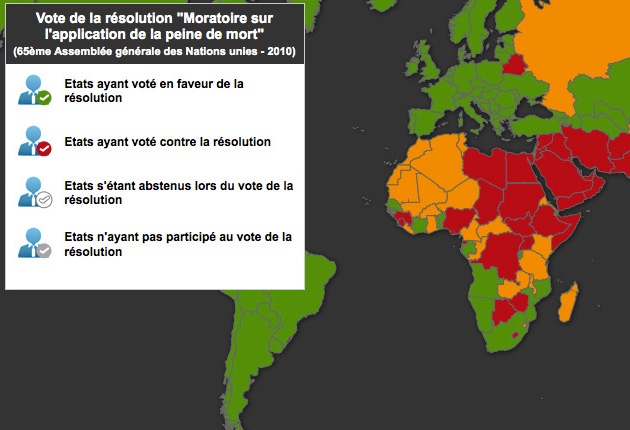 Note : Une fois n’est pas coutume, la diplomatie française a développé sur son site une carte permettant de visualiser les pays appliquant ou non la peine de mort dans le monde. Certes, on pourrait rêver une approche graphique un peu plus travaillée mais l’objectif est atteint : les données sont intéressantes et lisibles d’autant qu’elles sont recoupées avec les résultats du vote de la résolution “Moratoire sur l’application de la peine de mort” qui a eu lieu lors de la 65ème Assemblée générale des Nations unies en 2010).