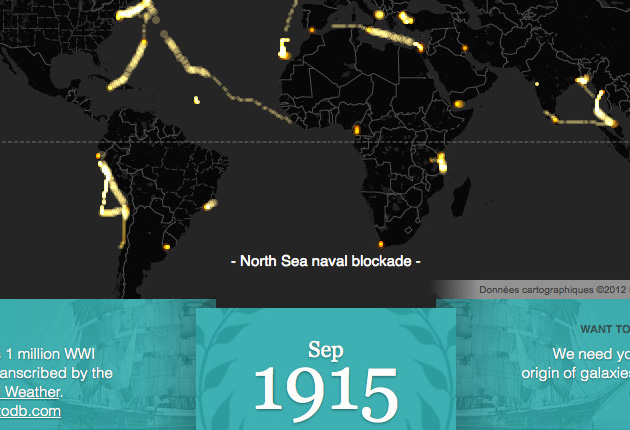 Note : Mise en avant sur le site du Guardian, cette infographie animée présente des données pharaoniques crowdsourcées par la communauté Old Weather : la localisation de chaque navire de la flotte de la Royal Navy au cours de la première guerre mondiale. Le résultat est donc bien sûr une cartographie des mouvements de ces vaisseaux sur les océans du globe. Seul bémol : une fois l’animation lancée, aucun bouton “pause” ni même “stop” n’est disponible pour agir sur la visualisation.
