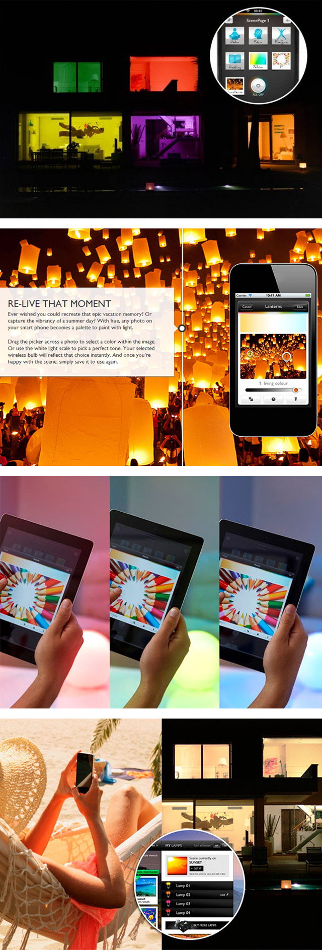 Cette ampoule est donc connectée à Internet et plus précisément à une application iPhone et iPad. Et oui, le smartphone et la tablette (ici transformés en télécommande) proposent une application qui permet de modifier la couleur de votre environnement selon plusieurs critères et de différentes façons. Cette “révolution design” est donc réservée aux utilisateurs d’Apple. Malgré tout son but est d’offrir une expérience nouvelle.